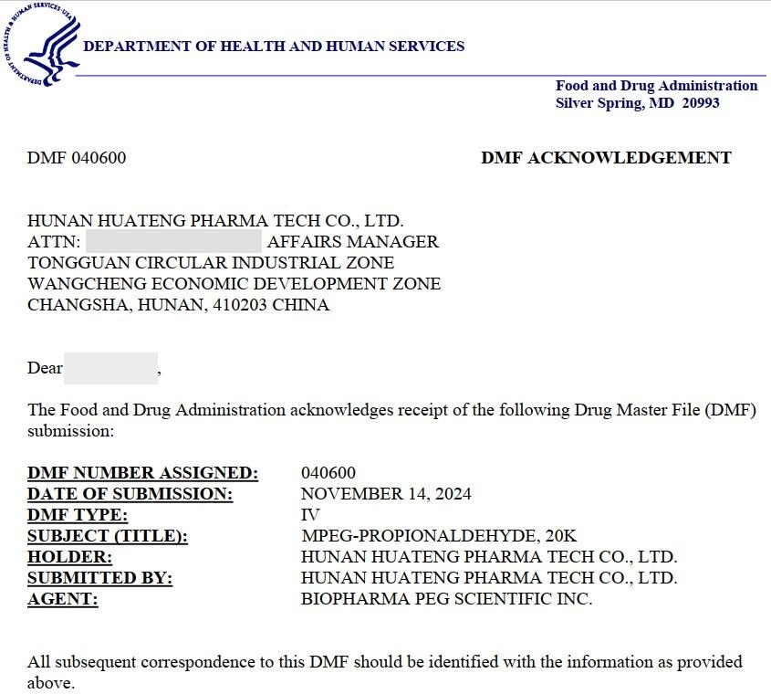 華騰制藥自主研發(fā)的mPEG-pALD(20K)產(chǎn)品成功獲得美國(guó)食品藥品監(jiān)督管理局(FDA)的藥品主文件(DMF)批準(zhǔn)(DMF編號(hào):040600)。…