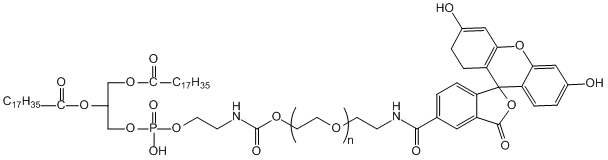 DSPE-PEG-FITC(1,2-二硬脂酰-sn-甘油基-3-磷酸乙醇胺-N-(聚乙二醇) - 熒光素(鈉鹽)是具有DSPE磷脂和熒光素FITC染料性能的線性異雙功能PEG化試劑