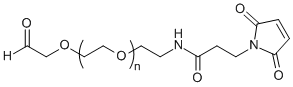 CHO-PEG-Mal(醛基聚乙二醇馬來酰亞胺)可以用來修飾蛋白質、多肽以及其他含有巰基的材料或者小分子。馬來酰亞胺和巰基在PH6.5-7.5很容易形成穩(wěn)定的硫醚鍵。